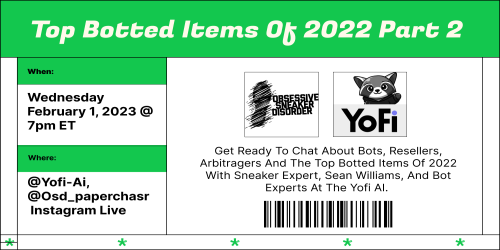 Last night, the legendary Sean Williams from Obsessive Sneakers Disorder joined us, and we counted down our 22 Top Botted Products of 2022! If you were unable to join live, check out the recording and our summary of our favorite products: