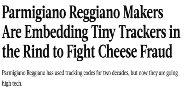 4. Parmesan Cheese: the entire Parmigiano Consortium is under attack from cheese markers, not from the region. They have begun implementing fraud trackers to fight against fraud.