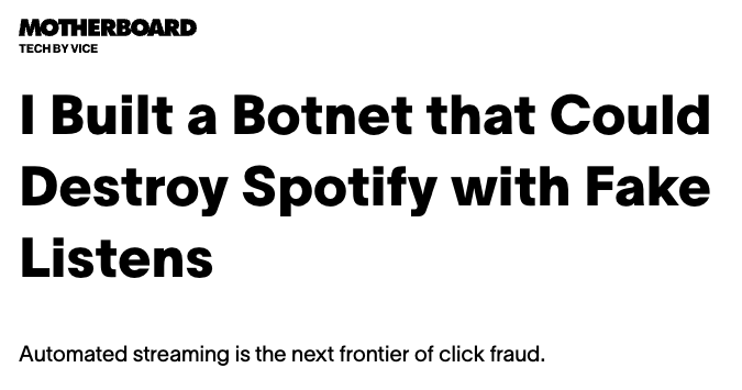 8) Spotify Playlists: artists have been hacking Spotify by using bots to listen to their music to boost their streaming payments, expand to new playlists, and acquire new followers. Shopify pays ~$2.74 per 1,000 streams; thus, some artists have been using bots to inflate their number of listens to cash in on the streaming payments! I highly recommend watching Black Market by Michael K Williams, as it is one of the more fascinating topics and takes you behind the scenes.