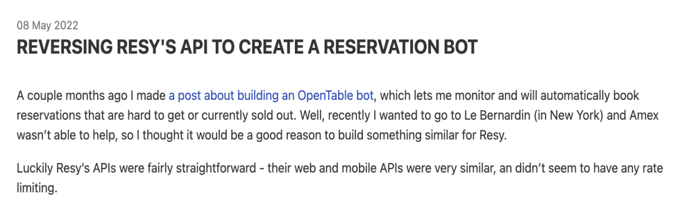6) Restaurants Reservations (Resy & Open Table): restaurant reservations have been one of the worst-kept secrets of the botting world. The constant demand for tables at the best restaurants makes it a prime opportunity for botters. Ever wonder why, on Resy or Opentable, when the tables at your favorite restaurants get booked immediately, even though you are frantically clicking refresh on the page? Botters are the ones beating you! These botters grab all the available reservations by using multiple profiles to make many reservations simultaneously, leaving us foodies disappointed.