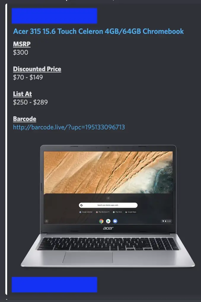 3) Acer: Some folks found a good reselling opportunity with Acer, as they were able to buy these laptops for $70–149 and able to flip them for $250–289! Solid profit for minimal work.
