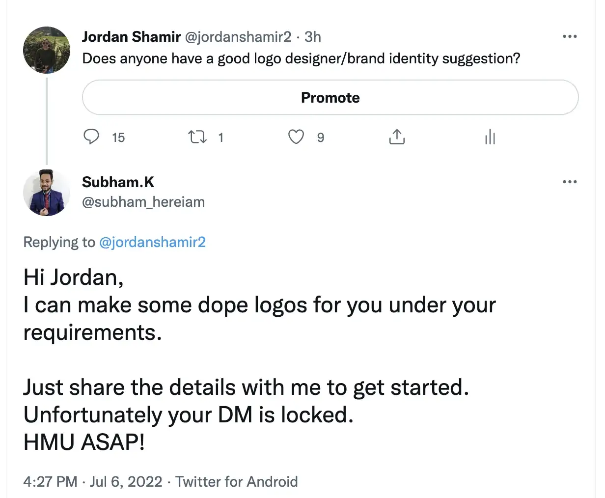I am not knocking the hustle but I never thought our search for a logo designer would lead back to bots. If you are looking to find a logo designer, 10–20 new followers on Twitter, and a bunch of slightly inappropriate DMs, then I have a solution for you!