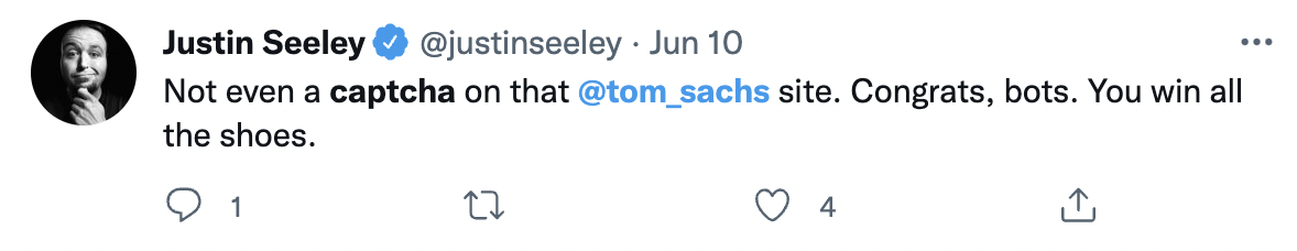 The bad customer experience stemmed from bots buying out the previous inventory of the original colorway and skewing the perception of customer demand. Now you need to go in stores to buy a sneaker that was supposedly sold out on SNKRS. I am all about the OG sneaker releases (scavenger hunt and more). However, this seems to stem from not only knowing the number of inventory to allocate, where your customer base is (which seems like random drops), and how to effectively reach your customers. I won’t plug Yofi (previously BotNot) too much, but @Tom Sachs can help you with this.